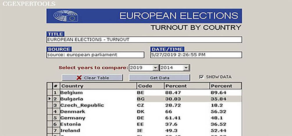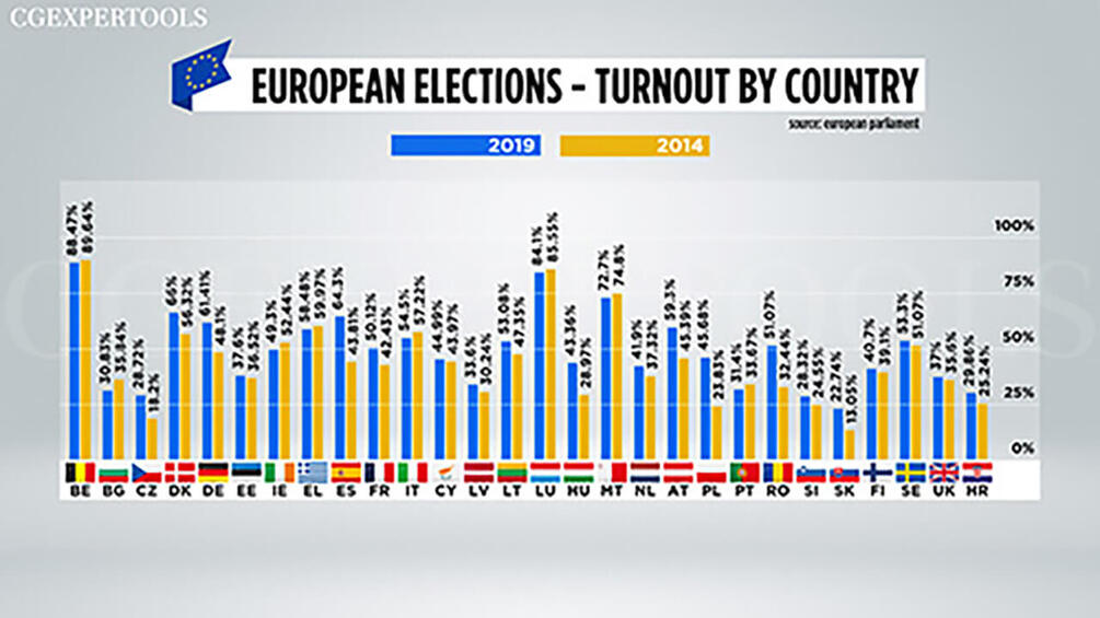 A vizrt scene with Pilot template showing the european elections turnout results by comparing data from two different years